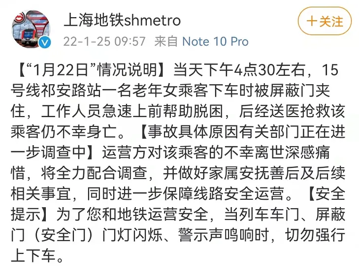女乘客被地铁门夹住,不幸身亡!最新通报来了