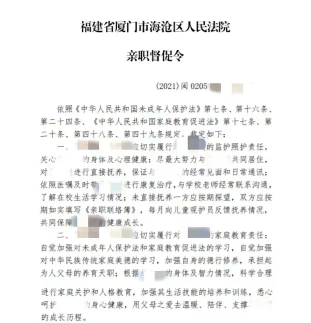 鉴于原被告双方均存在怠于履行监护人抚养及教育责任,主审法官当庭发出亲职督促令,督促原被告双方履行监护、照护和家庭教育责任,及时带小丽就医,共同呵护小丽的身心健康和顺利成长。