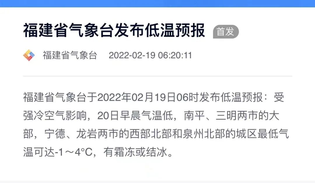 受强冷空气影响,20日早晨气温低,南平、三明两市的大部,宁德、龙岩两市的西部北部和泉州北部的城区最低气温可达-1~4℃,有霜冻或结冰。