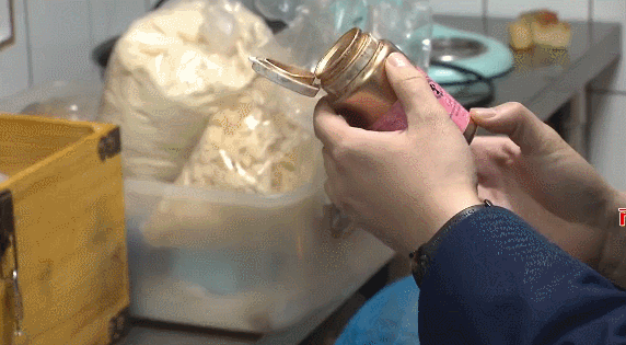 执法人员在餐厅后厨操作区下方置物架上,发现一瓶装有金色粉末的粉红色塑料瓶,其英文标识含有“gold(金)”,打开一看,里面的金色粉末基本上都已经用完了。记者看到,塑料瓶原有文字均为英文,贴在瓶身背面的白色贴纸已有些模糊,