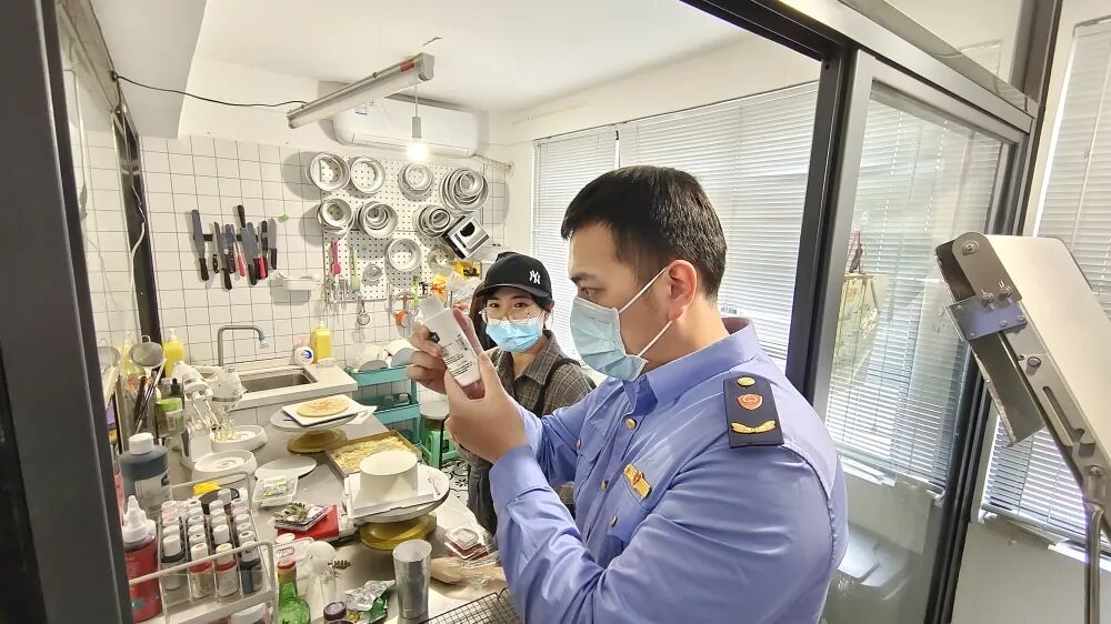 执法人员立即依法对该网红蛋糕店进行检查,现场发现其生产经营的糕点违法添加金箔。