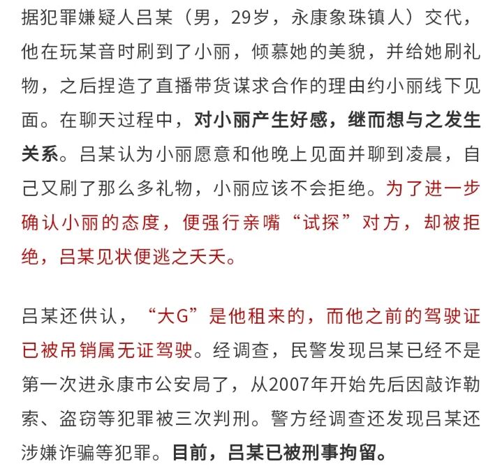 浙江一男子开“大G”约女主播见面,在车上欲行不轨……