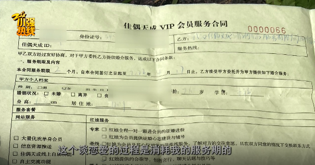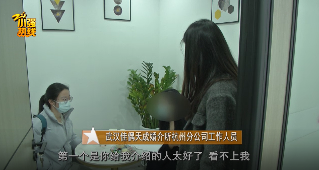 武汉佳偶天成婚介所杭州分公司工作人员我刚听到两个担心吧,第一个是你给我介绍的人太好了,看不上我;第二个担心是会不会我看不上他们。我觉得任何事情都是有风险的,我们机构能做的是让你的结果最大化。同时,佳偶天成表示,一旦客户恋爱,他们不再介绍对象,这也是对另外一方负责。在佳偶天成的服务合同上,可以看到有明确的免责声明,无法保证顾客最终建立恋爱关系或婚姻关系。目前储女士要求退费,婚介所也表明了立场。