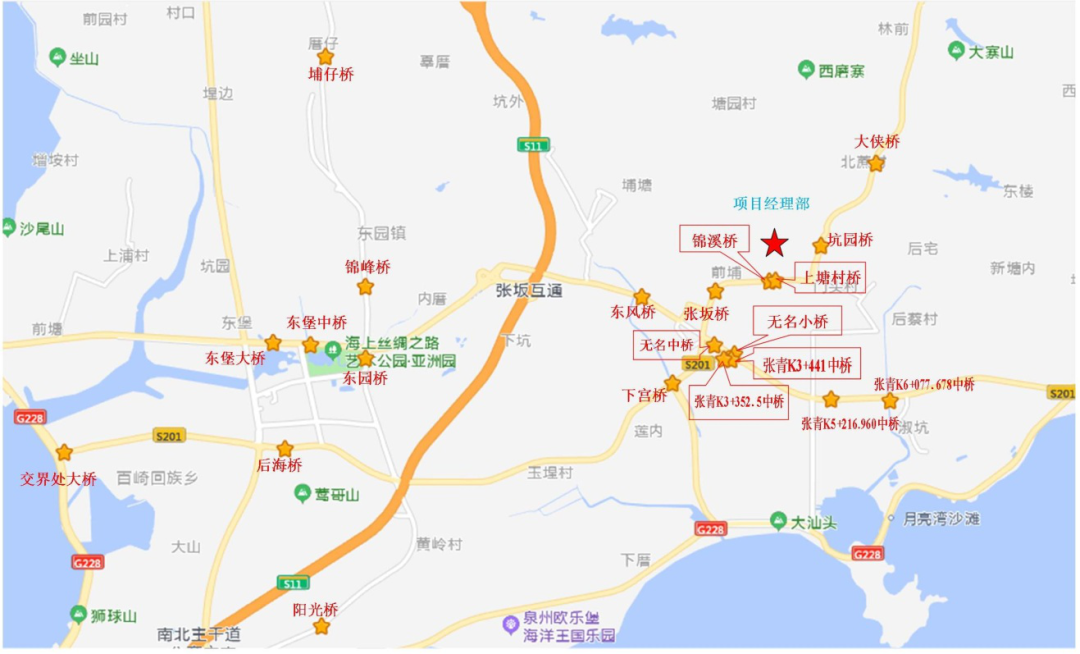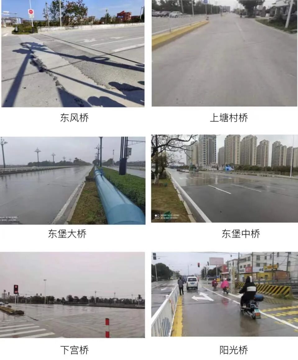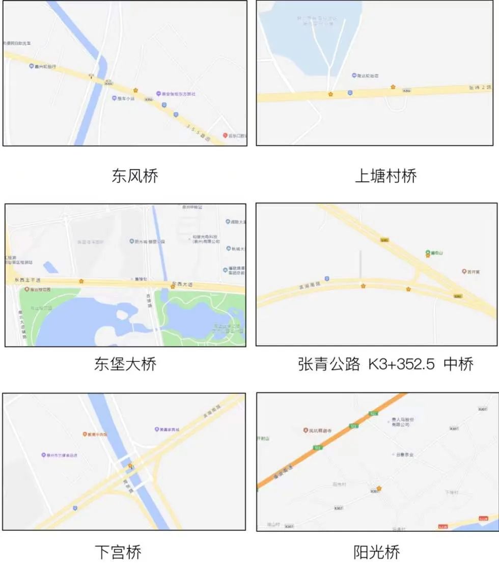 东堡大桥、东堡中桥位于东西主干道交通要道上;分两幅设置,双向八车道。现场交通流量较大。交通管制时间:2022.04.12—2022.05.30。 阳光桥位于307县道上(杏秀路南侧),邻近红绿灯路口,东侧约400米为日春茶业;分两幅设置,双向四车道。现场交通流量较大。交通管制时间:2022.03.01—2022.04.10。上塘村桥位于355县道上,西侧约100米为锦溪小学,南侧邻近中国石化加油站;现场实测桥长 12.2m,桥面总宽 17.5m,桥梁净高为 1.2m。双向四车道,交通流量较大。交通管制时间:2022.03.02—2022.04.12。东风桥位于X355县道东张公路上,邻近红绿灯路口,东侧约800m为张坂镇中学;双向四车道,交通流量较大,大车多。交通管制时间:2022.03.17—2022.04.26。下宫桥位于307县道滨湖南路上,邻近红绿灯路口,左侧为惠南电商园;双向六车道,交通流量较大。交通管制时间:2022.04.20—2022.06.04。张青公路 K3+352.5 中桥位于307县道滨湖南路上,全桥跨径为3×13m。双向六车道,交通流量较大。交通管制时间:2022.04.25—2022.06.09。高峰时段应加强对安全设施的检查与交通流的引导;项目定位图如下;