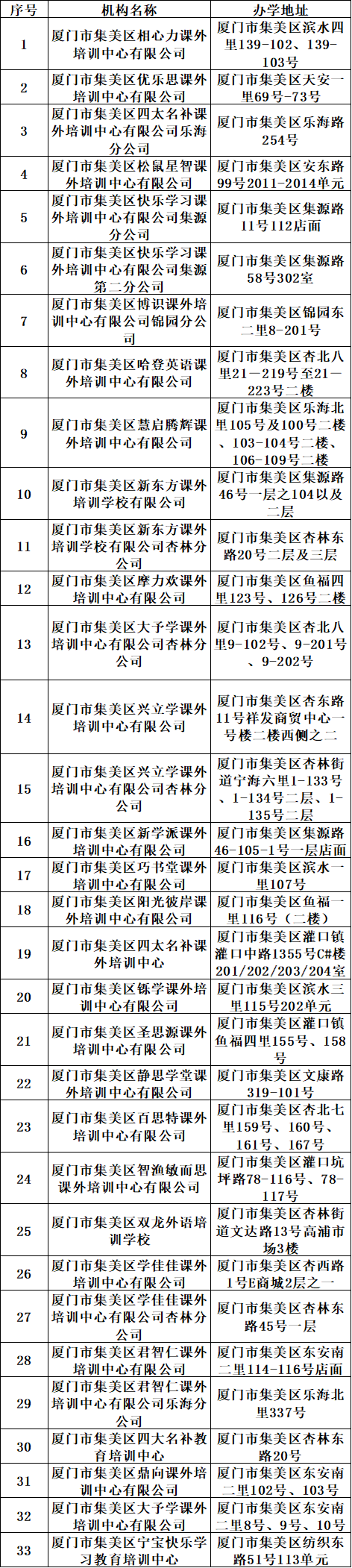 [font="]2月21日晚,集美区教育局对学科类校外培训机构开展抽查,[font="]发现集美区百分冠课外培训中心存在不规范办学行为。[font="]区教育局通报督导情况:[font="]1.疫情防控工作未落实到位;[font="]2.使用未经审核的培训教材;[font="]3.培训教室生均面积不足3平方米;[font="]4.在户外、楼宇等公共场所违规刊登校外培训广告,多次要求整改未落实。[font="]现责令集美区百分冠课外培训中心自即日起停业整改,整改完成后经集美区教育局重新审核后方可复课。集美区33所已注销校外培训机构名单公示[font="]集美区教育局通报说,[font="]33家校外培训机构已注销办学许可证,[font="]已终止办学或停止提供学科类培训服务。其办学许可证和印章自然废止,[font="]不再具备学科类培训的办学资质,不得再从事任何学科类培训活动。