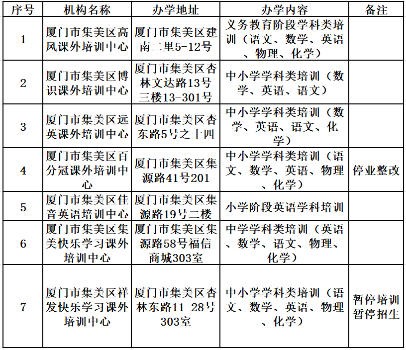 [font="]集美区教育局也公布集美区证照齐全的学科类校外培训机构名单,总共七家,不过,七家有两家违规培训,被停业整改。集美区证照齐全的学科类校外培训机构名单:非营利性学科类培训机构名单