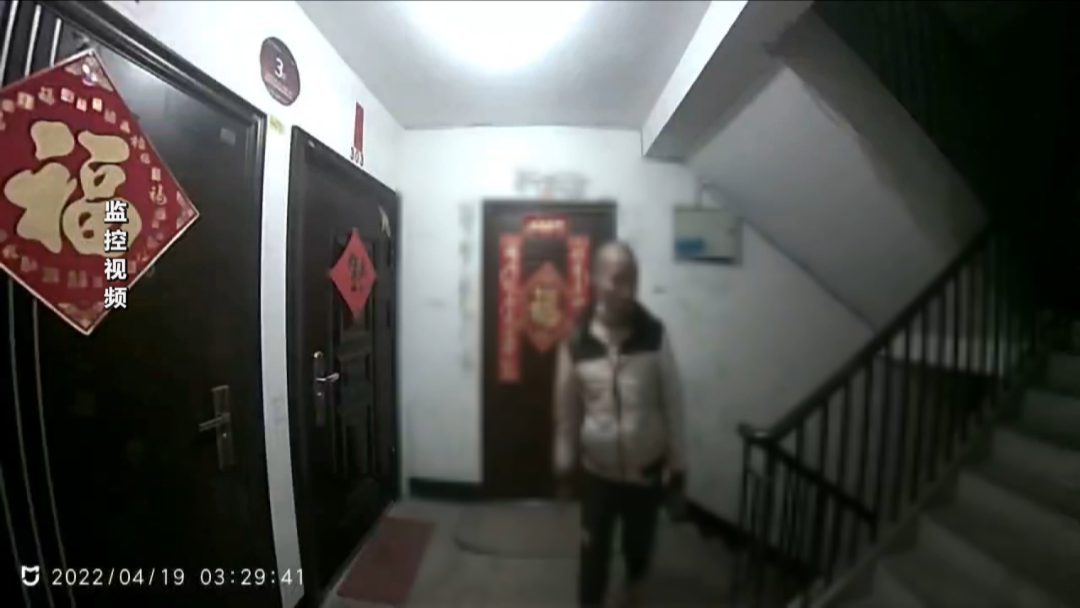 由于卢女士和丈夫反锁在屋内休息,这名男子在客厅没有收获,随后打开了大门往楼上走去,三楼一家住户的监控清晰地记录下了他的样子。