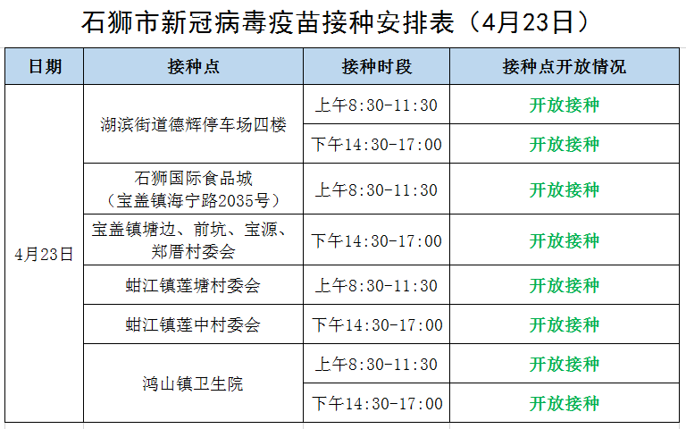 接种注意事项:1.接种新冠病毒疫苗人员48小时内不能进行核酸检测。2.前往接种人员请携带身份证,提前下载闽政通APP,扫码进场,并全程佩戴口罩。3.3-17周岁人员请在监护人陪同下,携带本人身份证(无身份证请携带户口簿)及父母一方的身份证进行接种,如有预防接种证一并携带;港澳台3-17周岁人员请在监护人陪同下,携带本人港澳台居民通行证及父母一方的身份证(或港澳台居民通行证)进行接种。4.接种第二针、加强针的人员,如前面针次不在石狮接种,请同时携带接种凭证。