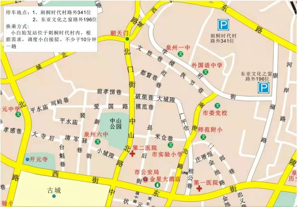 P+R交通模式(“P+R”全称“Park + Ride”,即“停车与换乘”模式),前往古城区车辆建议停放在外围停车场内,再乘坐公交车、“小白”接驳车、公共自行车等公共交通工具进入古城。节假日期间,泉州公交集团有限责任公司将增设公交及“小白”线路班次并开通1条公交接驳专线和2条“小白”接驳专线