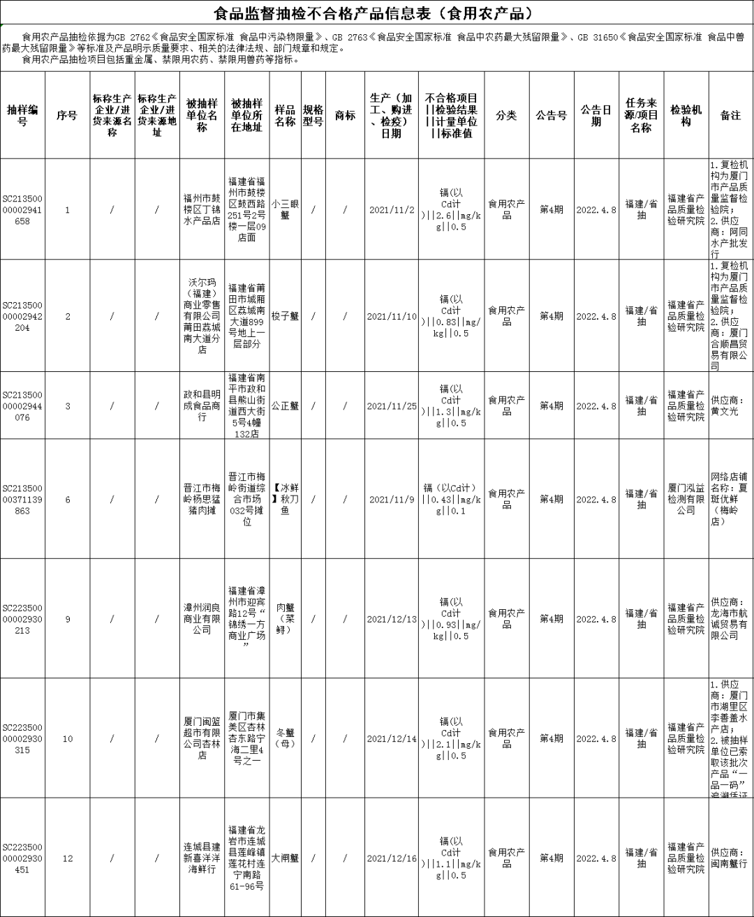 厦门闽篮超市有限公司杏林店销售的冬蟹(母)(购进日期为2021年12月14日),镉(以Cd计)不合格,检验机构为福建省产品质量检验研究院;