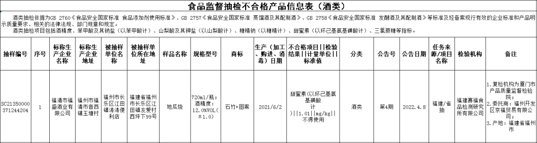 福清市福盛酒业有限公司2021年6月2日生产的地瓜烧,甜蜜素(以环己基氨基磺酸计)不合格,销售单位为福州市长乐区江田镇涛涛便利店,初检机构为福建赛福食品检测研究所有限公司,复检机构为厦门市产品质量监督检验院;