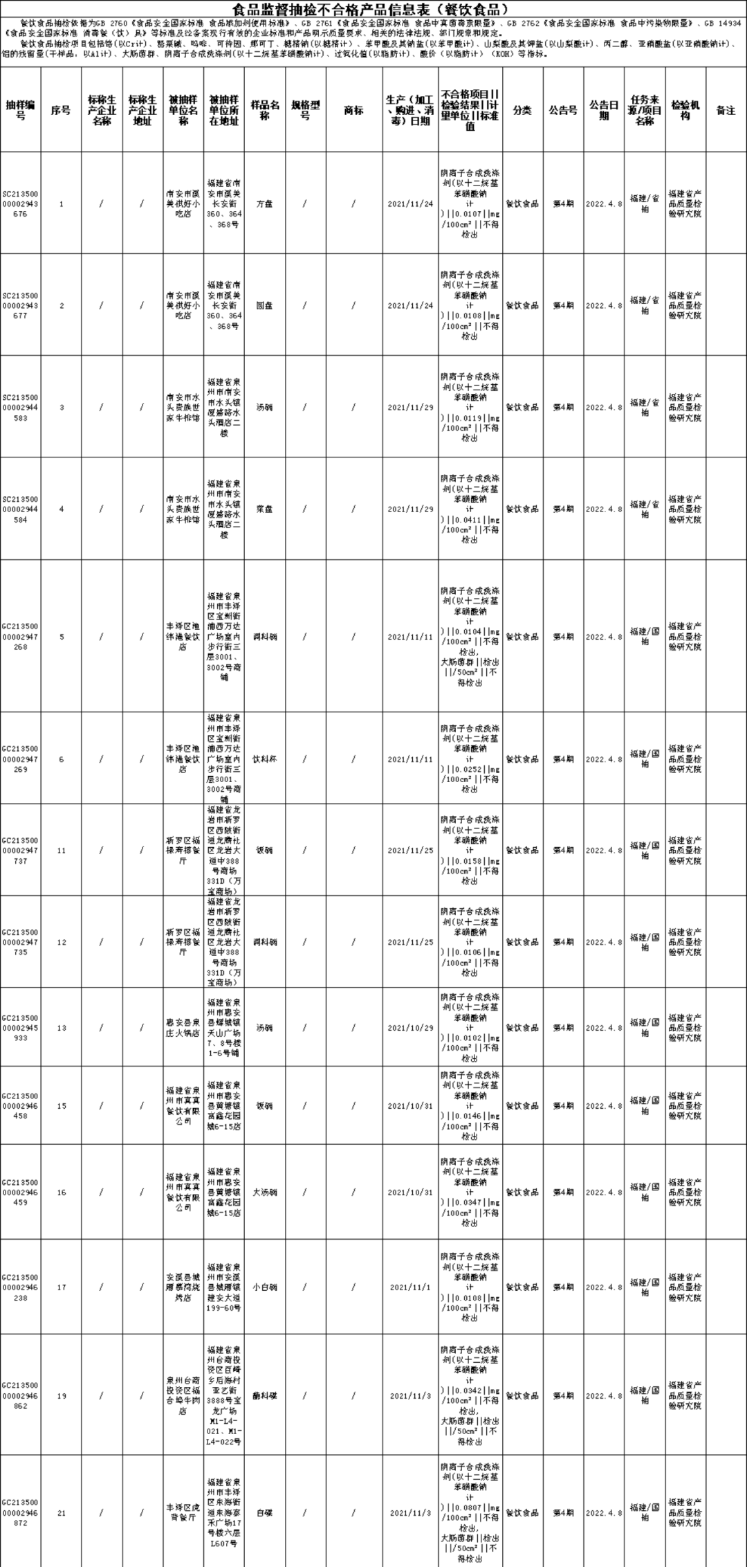 (消毒日期为2021年11月1日),大肠菌群不合格,检验机构为福建省产品质量检验研究院;