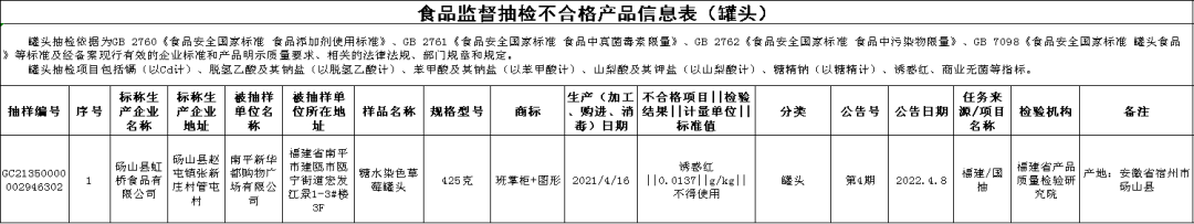 砀山县虹桥食品有限公司2021年4月16日生产的糖水染色草莓罐头,诱惑红不合格,销售单位为南平新华都购物广场有限公司,检验机构为福建省产品质量检验研究院。