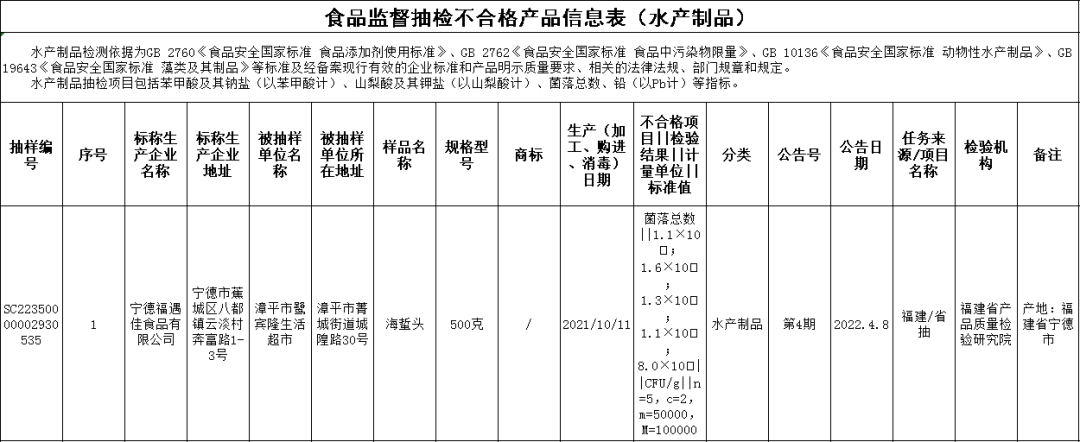 宁德福遇佳食品有限公司2021年10月11日生产的海蜇头,菌落总数不合格,销售单位为漳平市鹭宾隆生活超市,检验机构为福建省产品质量检验研究院;