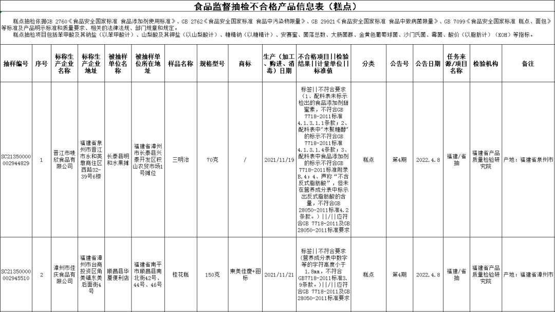 漳州市佳庆食品有限公司2021年11月21日生产的桂花糕,标签不合格,销售单位为顺昌县华厦便利店,检验机构为福建省产品质量检验研究院。