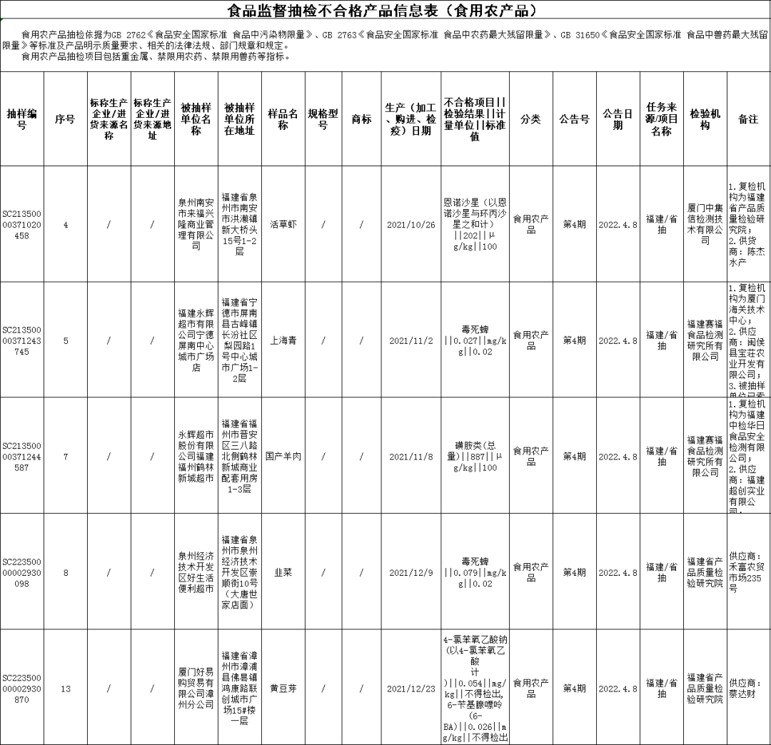 福建永辉超市有限公司宁德屏南中心城市广场店销售的上海青(购进日期为2021年11月2日),毒死蜱不合格,初检机构为福建赛福食品检测研究所有限公司,复检机构为厦门海关技术中心;