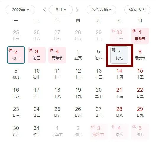 《关于2022年部分节假日安排的通知》2022年劳动节放假调休日期的具体安排:4月30日至5月4日放假调休共5天紧急提醒:5月7日(周六)要!上!班!要!上!班!要!上!班!(重要的话说三遍