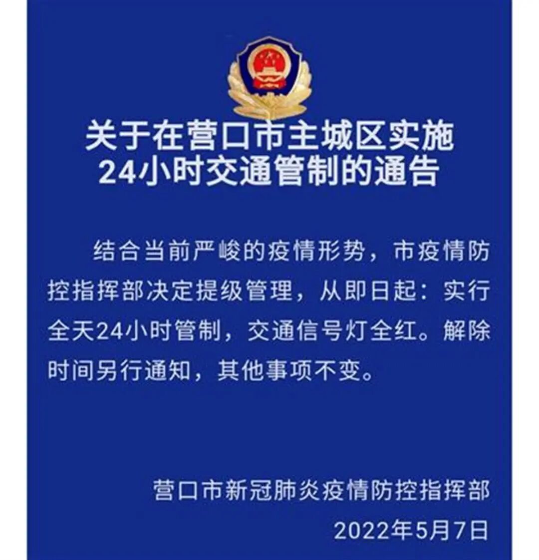 官网截图营口市疫情防控指挥部决定,从5月5日零时始,对站前区、西市区、老边区的住宅小区、村(社区)一律实行封闭式管理。营口市站前区居民林先生告诉极目新闻记者,他从5月4日起就没有出过小区,除了做核酸检测基本不下楼,小区目前是封闭管理状态,从窗户往外看,除了疫情防控工作者看不到其他闲逛的居民,附近马路上也基本看不到车辆,交通信号灯这两天也都是红色。大石桥市居民王女士告诉极目新闻记者,以前开车觉得路上要是车辆少点儿得多好,现在看着窗外空空荡荡的街道也觉得心里空荡荡的,期待营口早日结束疫情,早日恢复车水马龙的正常生活。5月7日,营口市疫情防控指挥部发布交通管制通告,称结合当前严峻的疫情形势,决定提级管理,从5月7日起实行全天24小时管制,交通信号灯全红。解除时间另行通知,其他事项不变。