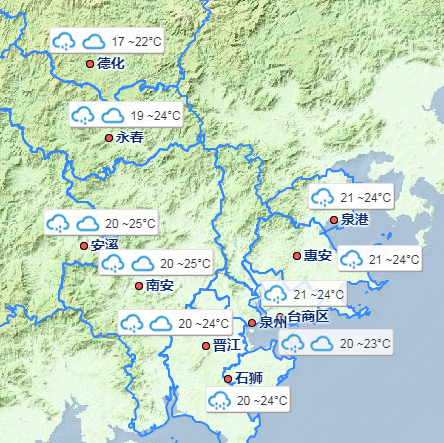受降水的影响本周福建大部分县市最高气温在22-26℃之间,早晨最低气温在17-22℃之间10 日,内陆地区有大雨,南平和三明的部分地区有暴雨,局部大暴雨。24 小时降水量 40~80 毫米,局部 110 毫米。11 日,龙岩、泉州、漳州、三明南部、 南平西部地区有大雨到暴雨, 龙岩局部大暴雨。12 日,全省有大雨,部分地区暴雨, 龙岩和泉州局部大暴雨。13 日, 沿海地区的部分有大雨到暴雨,局部大暴雨。