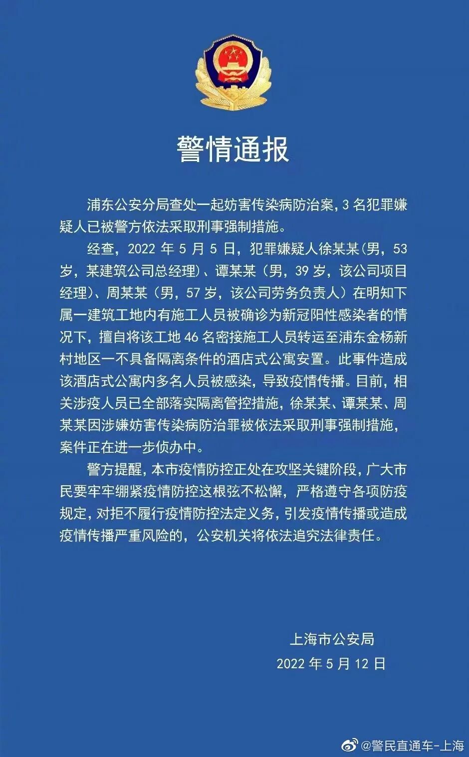 上海3名男子擅自转移46名密接致多人感染!警方通报