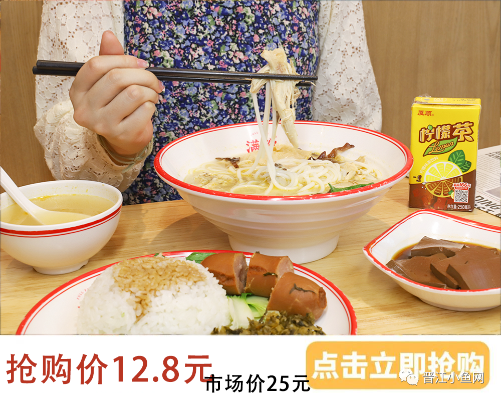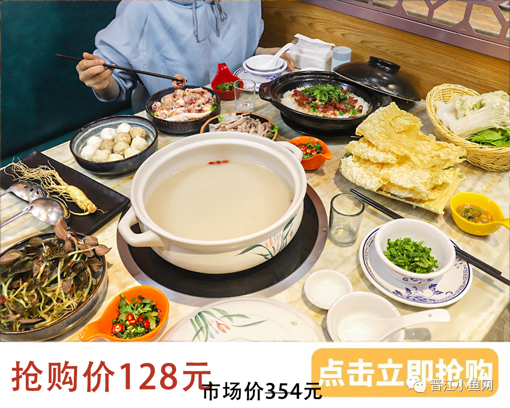 八度妖胡椒猪肚鸡 地址:[font=微软雅黑, "]晋江青阳华光路485号(帝豪酒店红绿灯新华眼镜隔壁)电话 :15375712393营业时间:早上10:00-凌晨2:00 2 ● — 49.9元抢原价150元烤田鸡套餐 — ● 御品御香美食府 地址:晋江市梅岭街道梅青社区湖光路606-3号(一中南门公路边往五店市方向)营业时间:下午16:00-凌晨2:003 ● — 138元抢原价258元自助餐 — ● 石狮明昇铂尔曼酒店 地址:石狮市石泉路329号电话 :0595-88888888营业时间:下午18:00-晚上21:304 ● — 49.9元抢208元茶叶礼盒 — ● 庄典茶叶 地址:晋江市石鼓路366号(晋江市一中北大门斜对面) 电话 :15060606136营业时间:上午09:00-晚上21:005 ● — 78元抢原价166元烤鱼套餐 — ● 江湖渔道 地址:晋江阳光时代广场大地影院旁(金溪路与和平路交叉口)电话 :0595-82078732;15859489826营业时间:上午10:00-中午14:00 下午16:30-凌晨03:006 ● —69.9元抢原价168元(2-3人)烤鱼套餐 — ● 御品御香美食府 地址:晋江市梅岭街道梅青社区湖光路606-3号(一中南门公路边往五店市方向)营业时间:下午16:00-凌晨2:007 ● — 9.9元抢原价19元雷火丰套餐 — ● 雷火丰鲜虾大馄饨 地址:晋江市青阳街道金溪路1-6号电话 :17750859912营业时间:早上8:00-晚上12:008 ● — 12.8元原价25元鸡丝米粉套餐 — ● 满粉▪鸡汤米粉 地址:晋江万达金街A025电话 :13959998192营业时间:早上10:30-晚上22:309 ● — 19.9元抢雷火丰28元套餐— ● 雷火丰鲜虾大馄饨 地址:晋江市青阳街道金溪路1-6号电话 :17750859912营业时间:早上8:00-晚上12:0010 ● — 9.9元抢满粉17元套餐 — ●  满粉▪鸡汤米粉 地址:晋江万达金街A025电话 :13959998192营业时间:早上10:30-晚上22:3011 ● — 13.8元抢雷火丰21元套餐 — ● 雷火丰鲜虾大馄饨 地址:晋江市青阳街道金溪路1-6号电话 :17750859912营业时间:早上8:00-晚上12:00