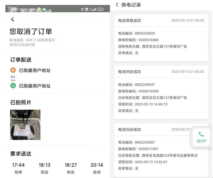 订单取消信息及换电记录截图跑腿小哥说,之所以会提到撕毁文件,并不是为了索要钱财,而是希望博主不要再催促。整个过程中,并没有收到一分钱。