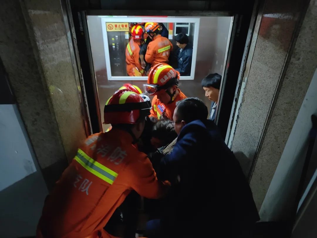 此时被困人员没有动静,疑似晕厥。消防救援人员立即组织战斗小组对电梯门实施扩张,仅用2分钟便成功救出被困人员,随后消防救援人员协助医护人员将其安全转移到救护车上。