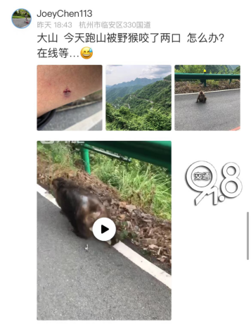 “今天跑山被野猴咬了两口怎么办?在线等!”有听众在杭州交通91.8官方APP开吧发帖求助,自己在临安往安徽方向的“皖南川藏线”骑行时,被野猴咬伤了!