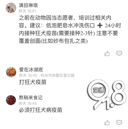 被猴咬的伤口约有两厘米的长,不仅破皮出血,还逐渐出现淤青。陈先生便向杭州交通91.8发帖求助,不少网友建议陈先生立刻清洗伤口,去医院打疫苗。