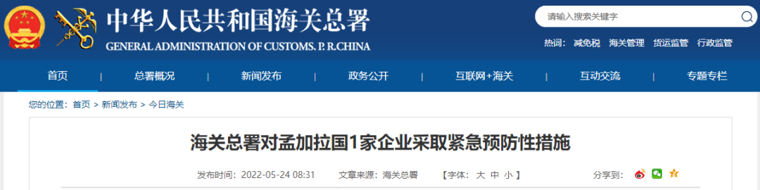 海关总署对孟加拉国1家企业采取紧急预防性措施