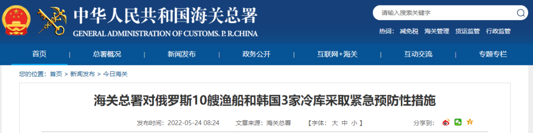 海关总署对俄罗斯10艘渔船和韩国3家冷库采取紧急预防性措施