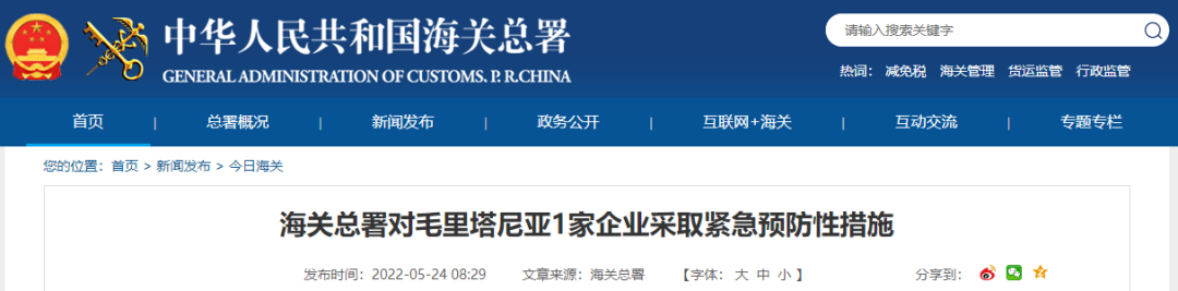 海关总署对毛里塔尼亚1家企业采取紧急预防性措施