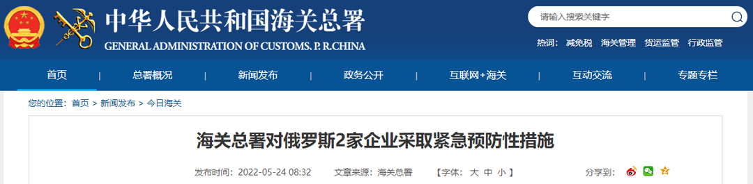 海关总署对俄罗斯2家企业采取紧急预防性措施