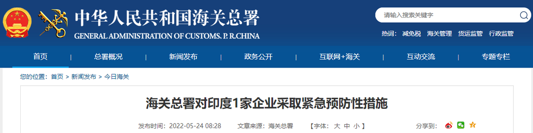 海关总署对印度1家企业采取紧急预防性措施