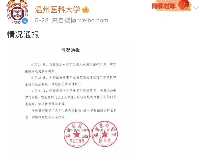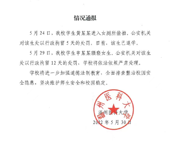 [font=mp-quote, -apple-system-font, blinkmacsystemfont, "]5月31日凌晨,[font=mp-quote, -apple-system-font, blinkmacsystemfont, "]温州医科大学(以下简称“温医大”)官方微博[font=mp-quote, -apple-system-font, blinkmacsystemfont, "]发布通报[font=mp-quote, -apple-system-font, blinkmacsystemfont, "]↓↓[font=mp-quote, -apple-system-font, blinkmacsystemfont, "]该校一名学生猥亵女生,[font=mp-quote, -apple-system-font, blinkmacsystemfont, "]被公安机关处以12天行政拘留的处罚。[font=mp-quote, -apple-system-font, blinkmacsystemfont, "]另一名学生进入女厕偷拍[font=mp-quote, -apple-system-font, blinkmacsystemfont, "]被处以5天行政拘留的处罚,[font=mp-quote, -apple-system-font, blinkmacsystemfont, "]目前该生已退学。 据温医大官方微博通报,5月29日,该校学生申某某猥亵女生,公安机关对该生处以行政拘留12天的处罚,学校将依法依规严肃处理。5月24日,有网友发帖称,浙江温州医科大学一男生尾随女生进入女厕偷拍,此事引发广泛关注。5月26日,学校启动调查后,决定给予涉事学生黄某某记过处分。5月27日,学校根据有关学生提供的新情况,向属地公安报案。黄某某被公安机关行拘5天,目前该生已退学。学校将全面排查整治校园安全隐患,坚决维护师生安全和校园稳定。