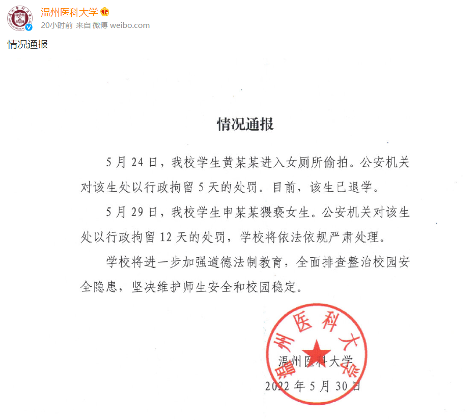 温州医科大学官方微博5月31日凌晨发布情况通报,全文如下:
