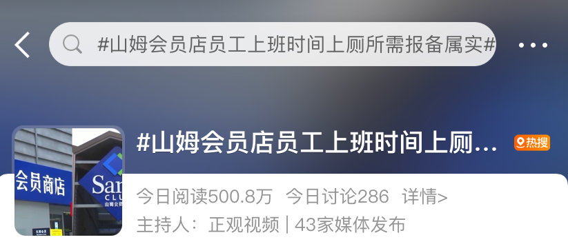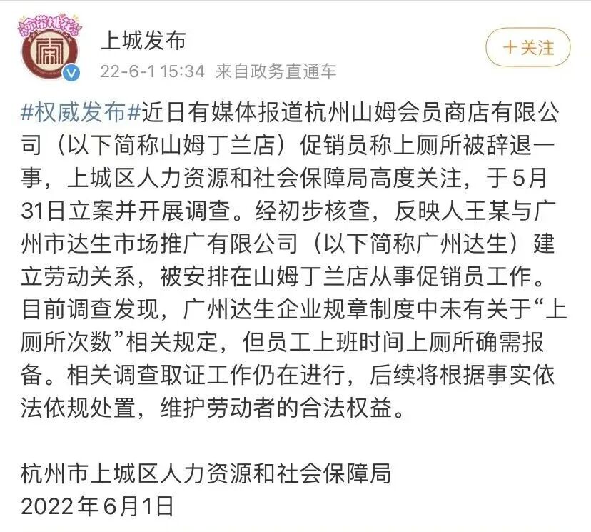 近日,有媒体报道,浙江杭州一山姆会员店促销员因上厕所被开除。该名促销员称,公司要求上班时间只能上2次厕所,必须在群里报备。6月1日,