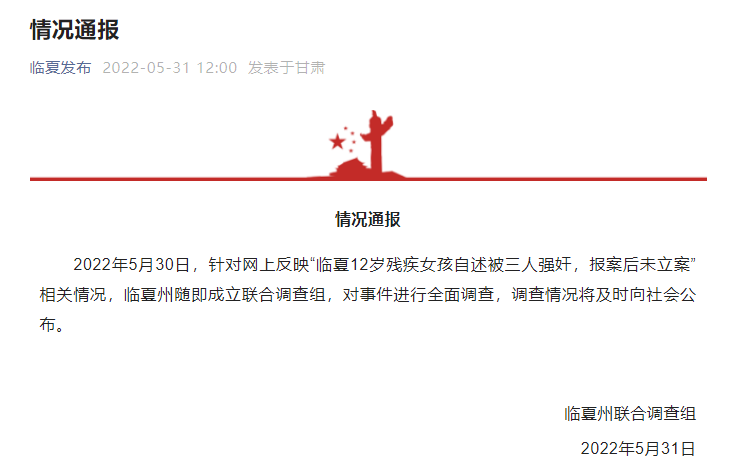 5月31日,临夏通报称:已经成立联合调组,调查情况将及时向社会公布。