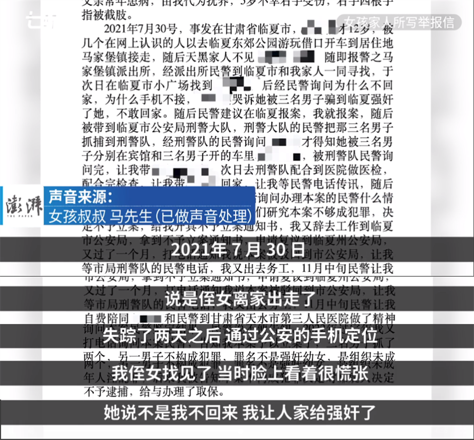 马先生称当时警方提取证物,进行鉴定,但给出不予立案的结果。经过刑事复核,最后口头告知系组织未成年人淫乱罪,三人被取保候审。后自己多次向检察院等举报,均未获得相应处理意见。马先表示,思思命苦,希望嫌疑人得以严惩。