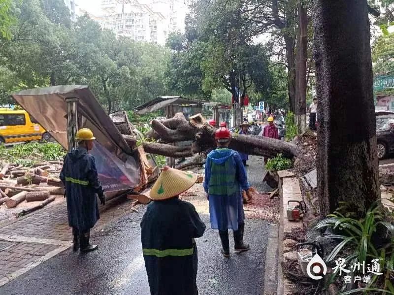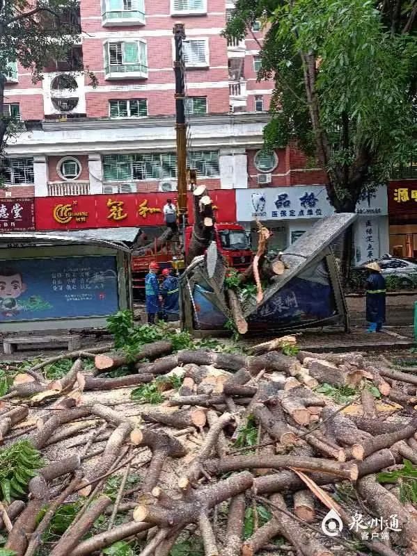丰泽交警二中队出动多名警力先行清理路面障碍的枝叶,泉州市城管局绿化中心还在紧张清理残枝断木,目前已经有两个车道可以通行。
