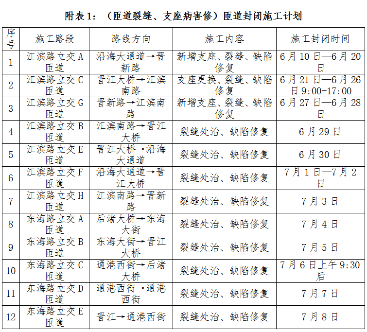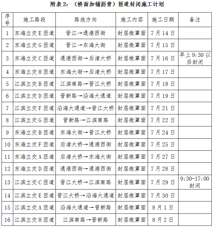 一、管制时间2022年6月10日至2022年8月2日,各匝道具体封闭时间详见附表1和附表2。(如遇台风、暴雨等恶劣天气无法进行施工,则管制日期顺延)