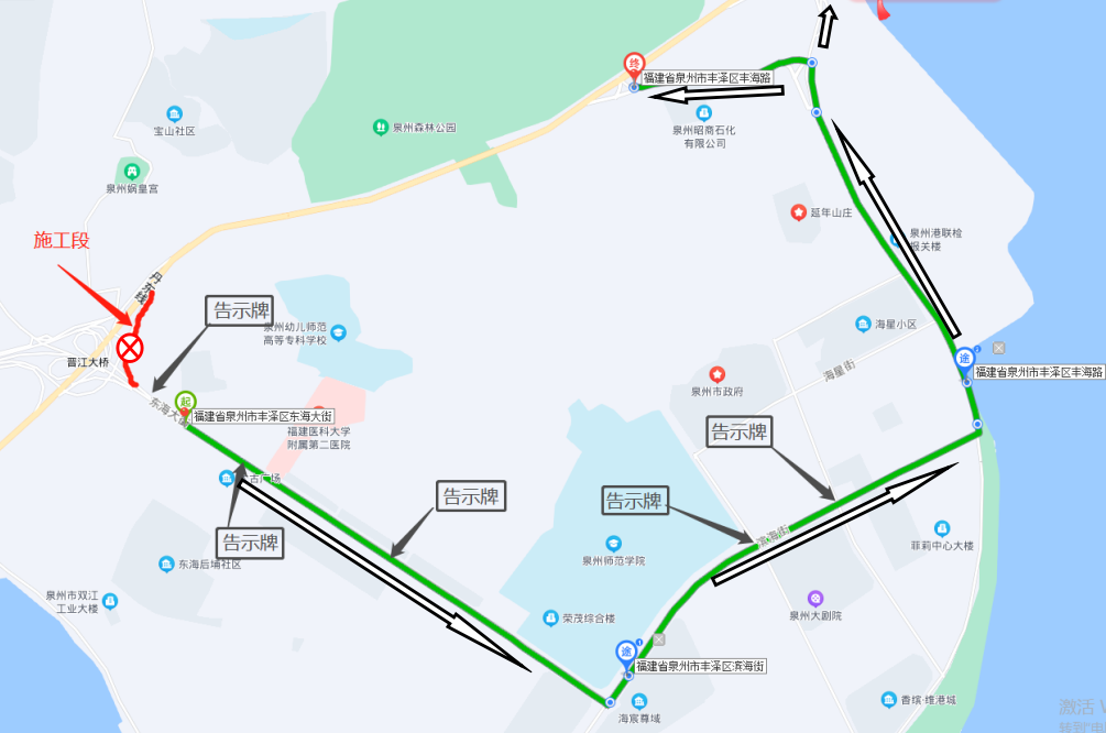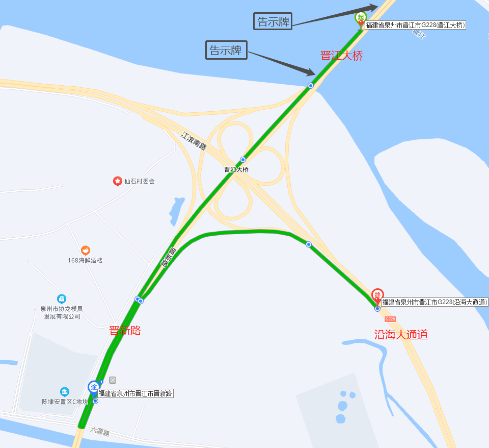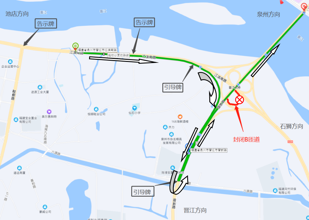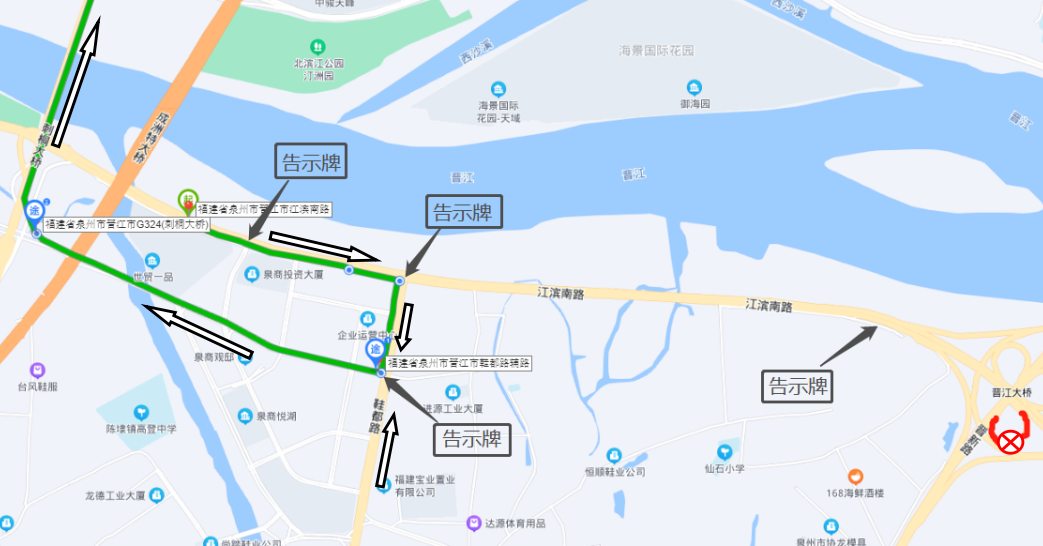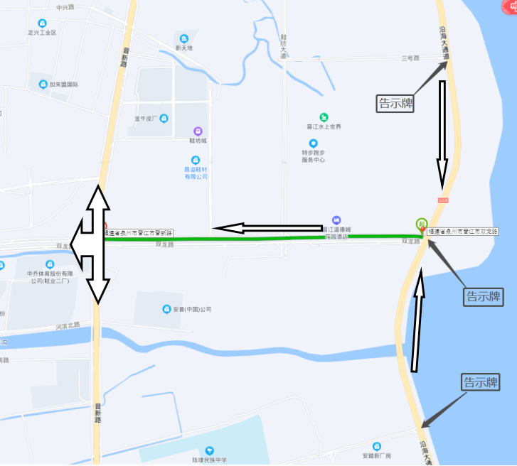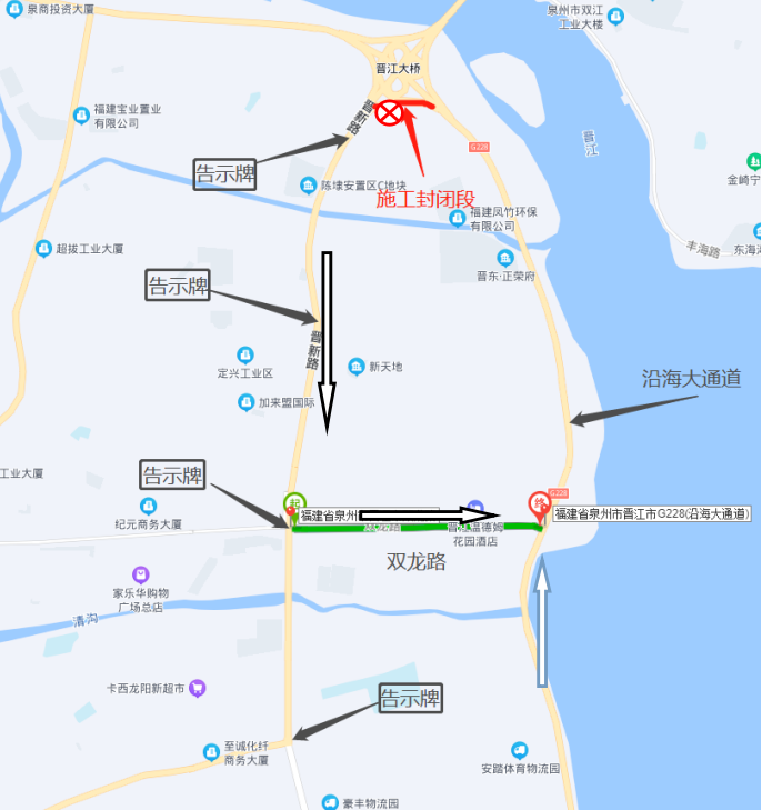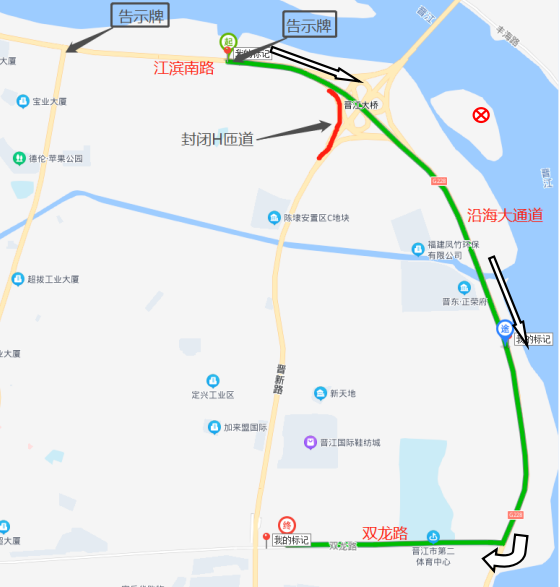 从石狮方向来车往泉州方向的,可由沿海大通道→晋新路掉头→晋江大桥,或沿海大通道→江滨南路(池店方向)掉头→晋江大桥通行。(在沿海大通道与双龙路交叉口增设导行告示牌,绕行双龙路至晋新路)如下图所示: