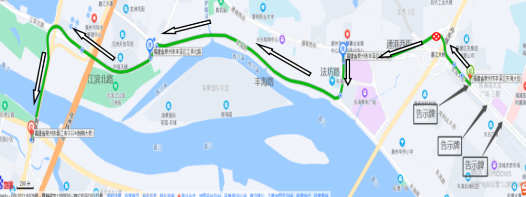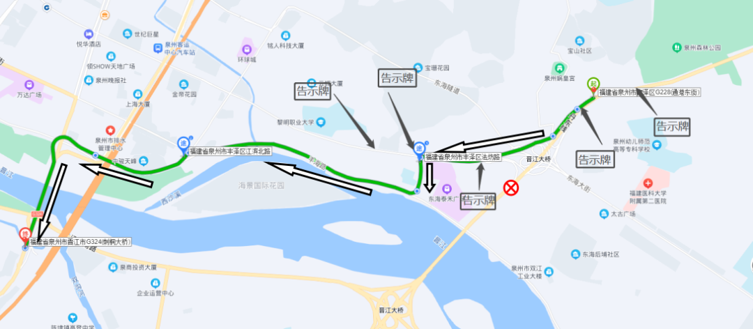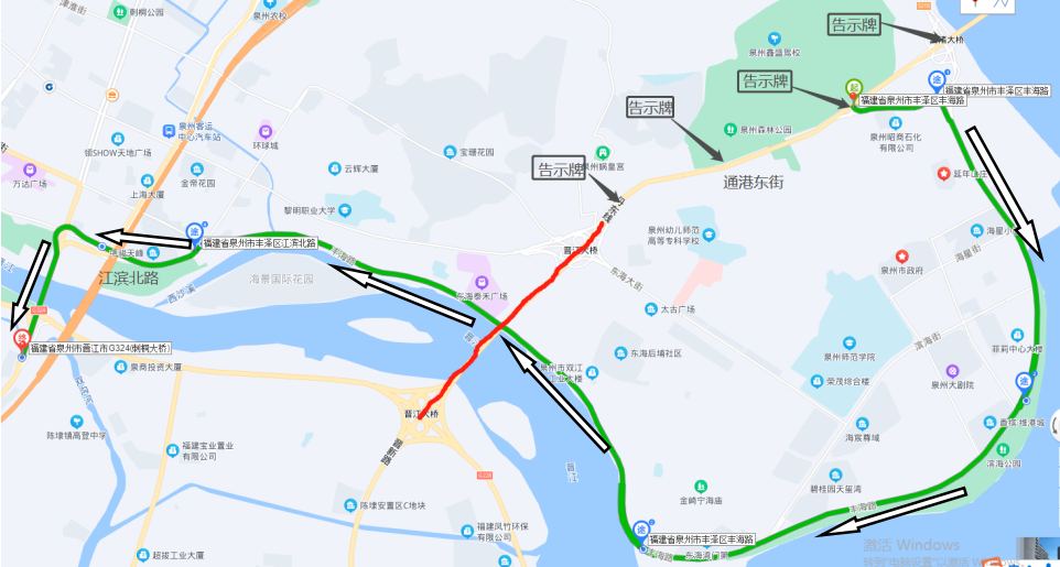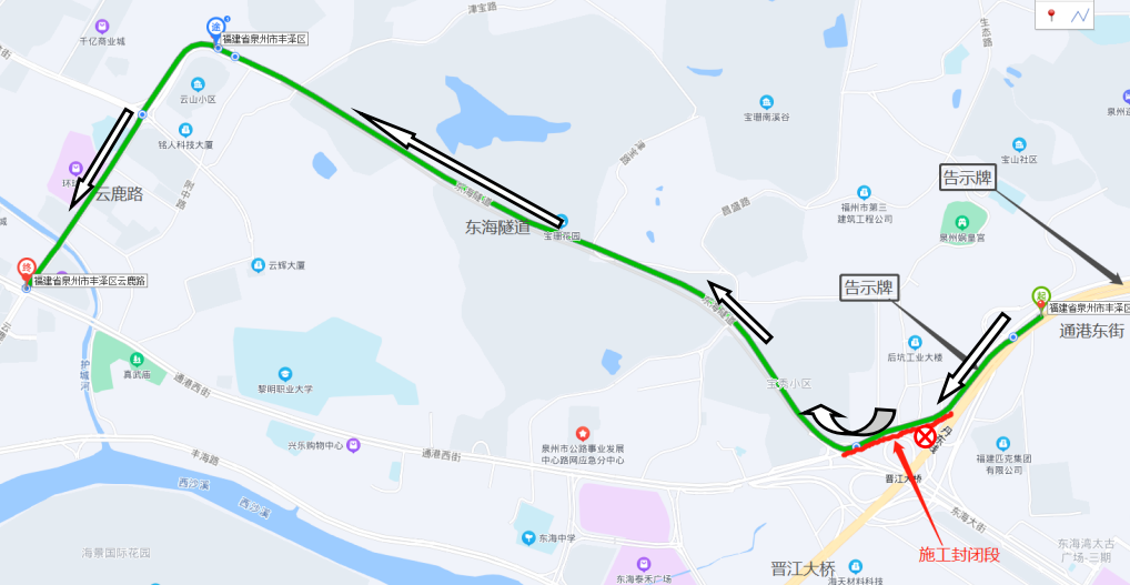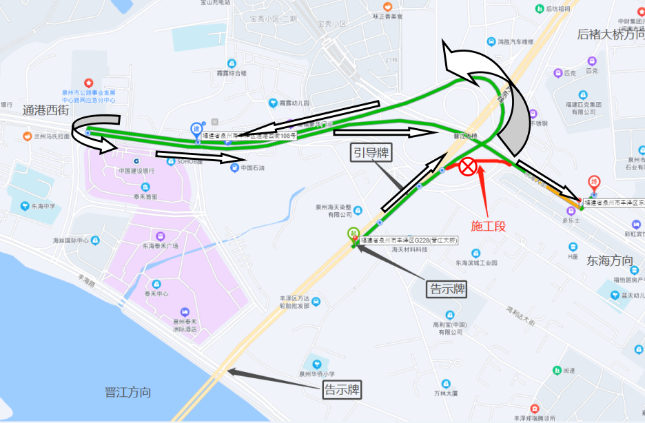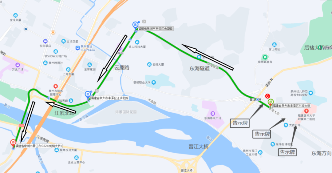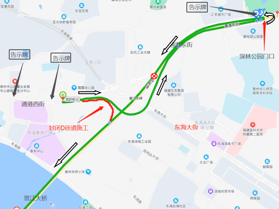 从晋江方向来车往通港西街方向的:由晋江大桥直行至森林公园掉头→通港西街通行。(通往东海大街掉头的G匝道同时放行)如下图所示:
