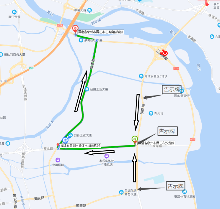:晋新路→双龙路→鞋都路→江滨南路(池店方向)通行。如下图所示:
