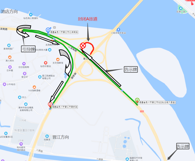 从晋江方向来车往池店方向的,可由晋新路→沿海大通道(石狮方向)掉头→江滨南路(池店方向)通行。如下图所示:
