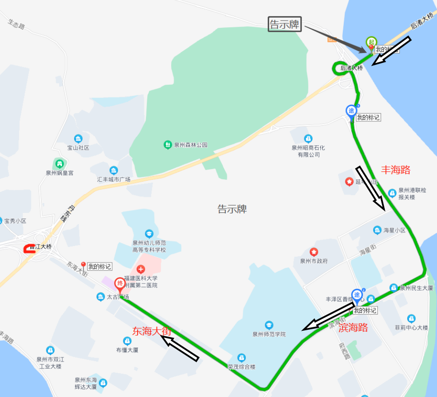 由法坊路→丰海路→江滨北路→刺桐大桥通行。如下图所示: