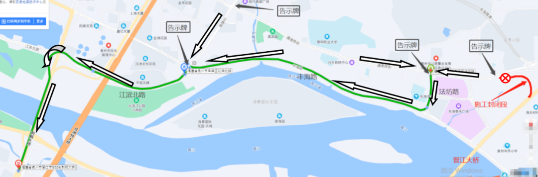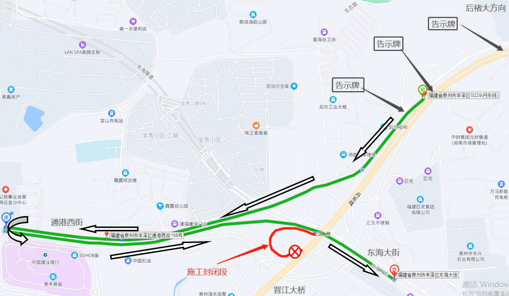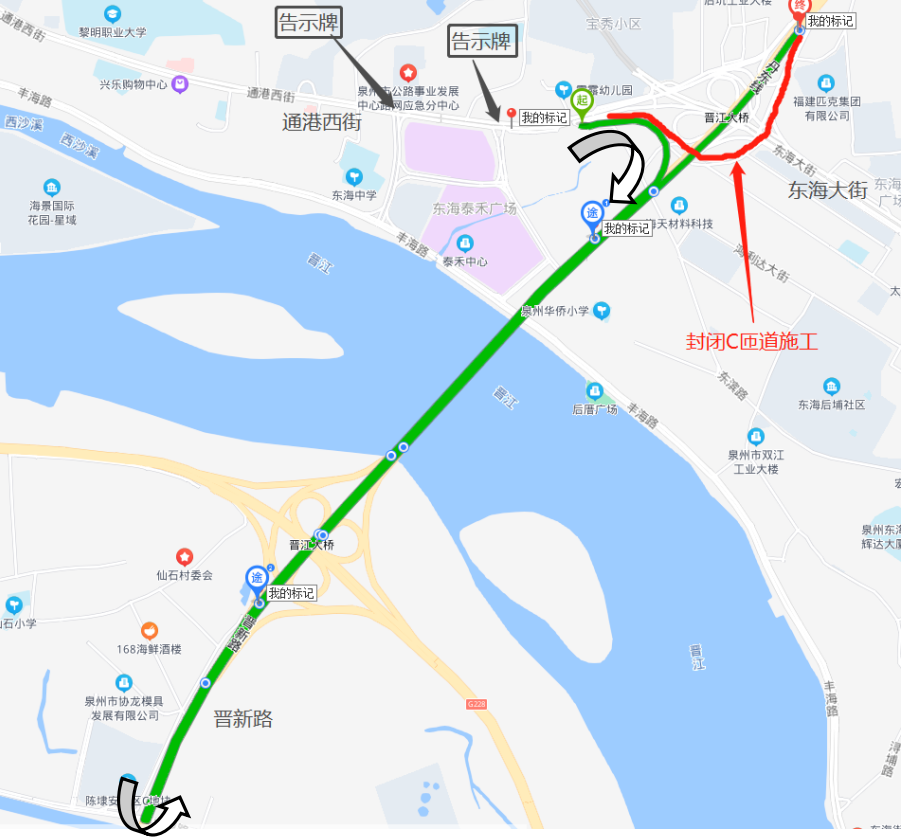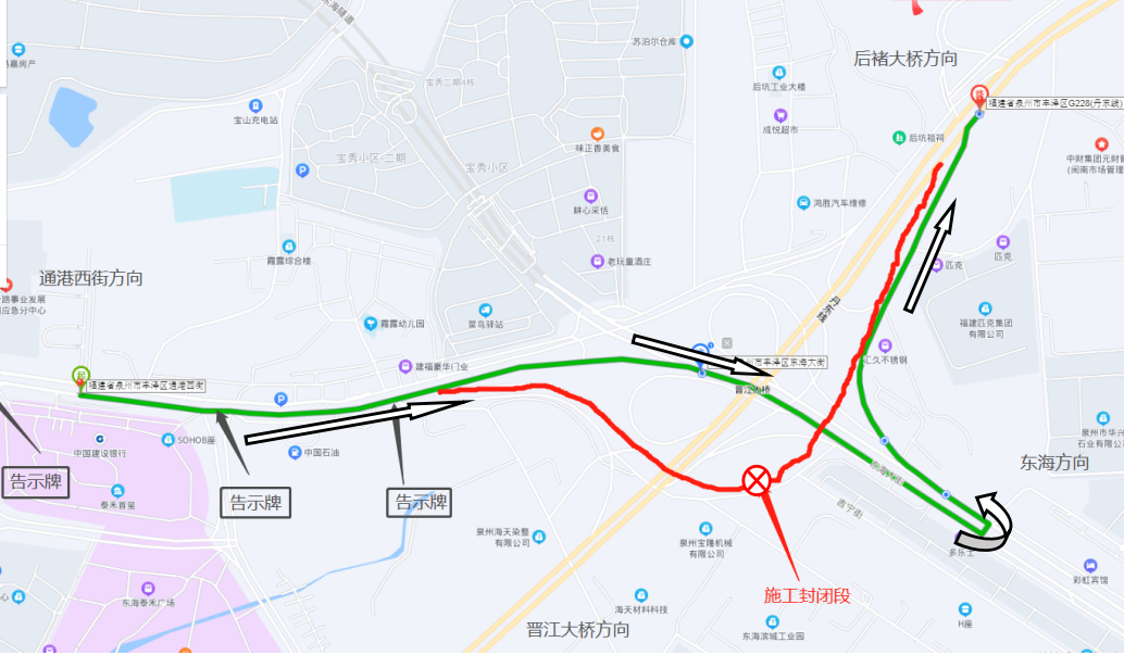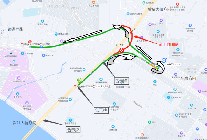 从通港西街方向来车往后渚大桥方向,由通港西街→过晋江大桥后在晋新路红绿灯路口调头→通港东街。(当天施工封闭时间由上午9:30以后开始)如下图所示: