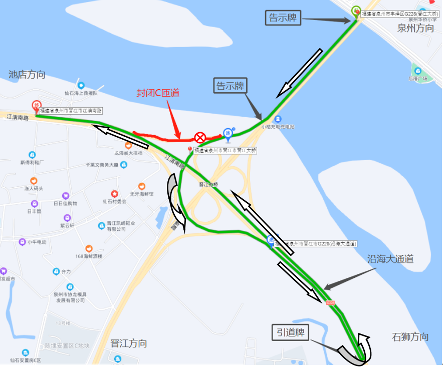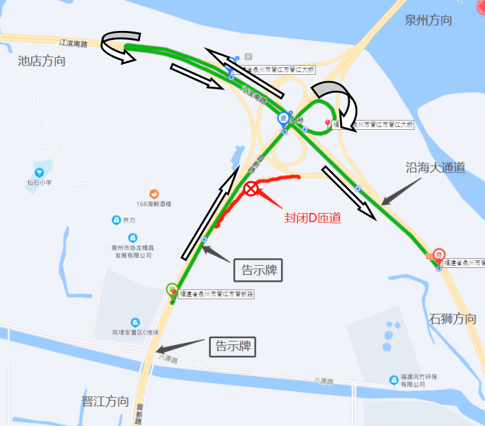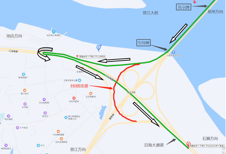 从泉州方向来车往池店方向的,可由滨海立交→沿海大通道(石狮方向)掉头→江滨南路通行。如下图所示: