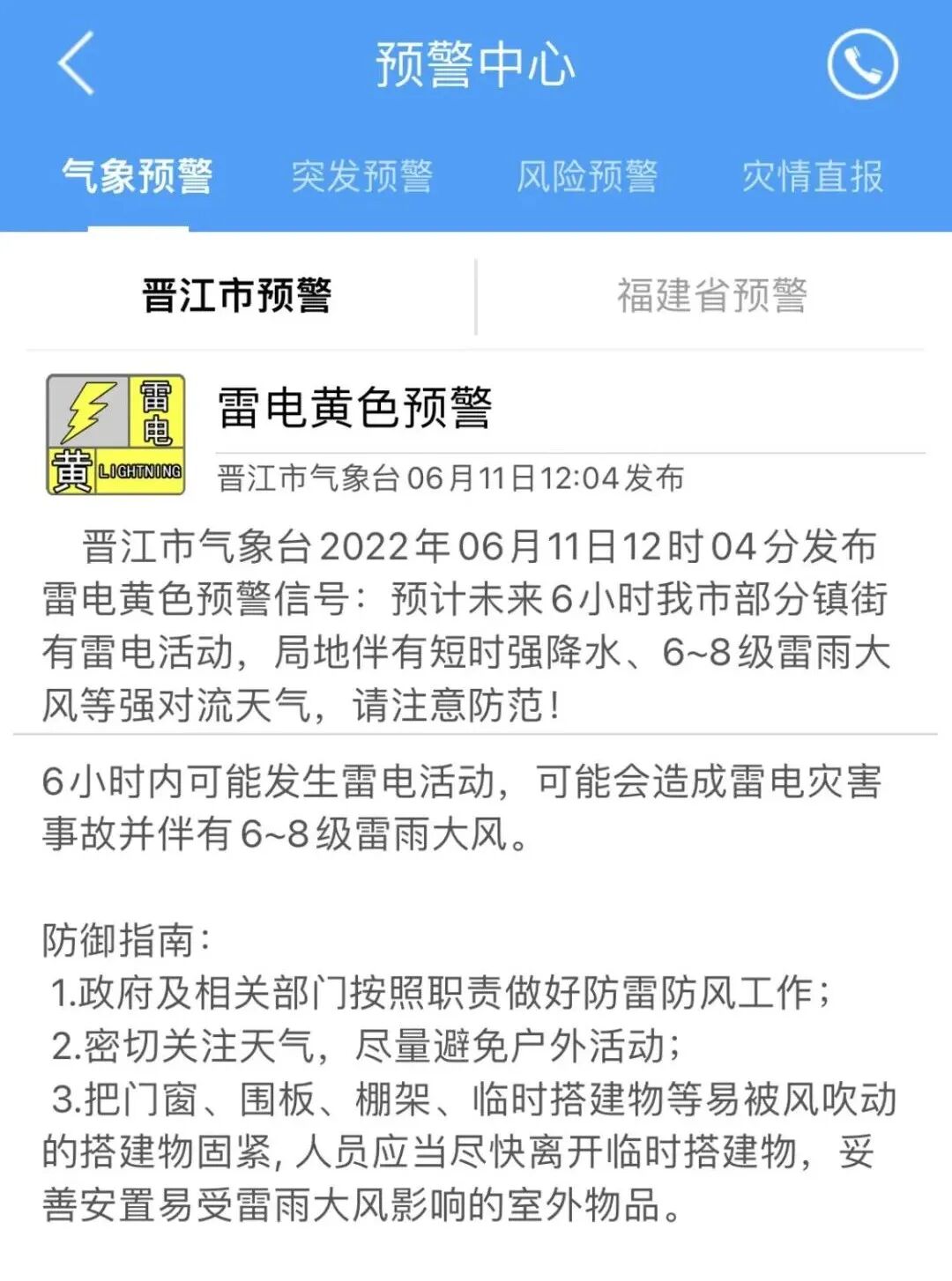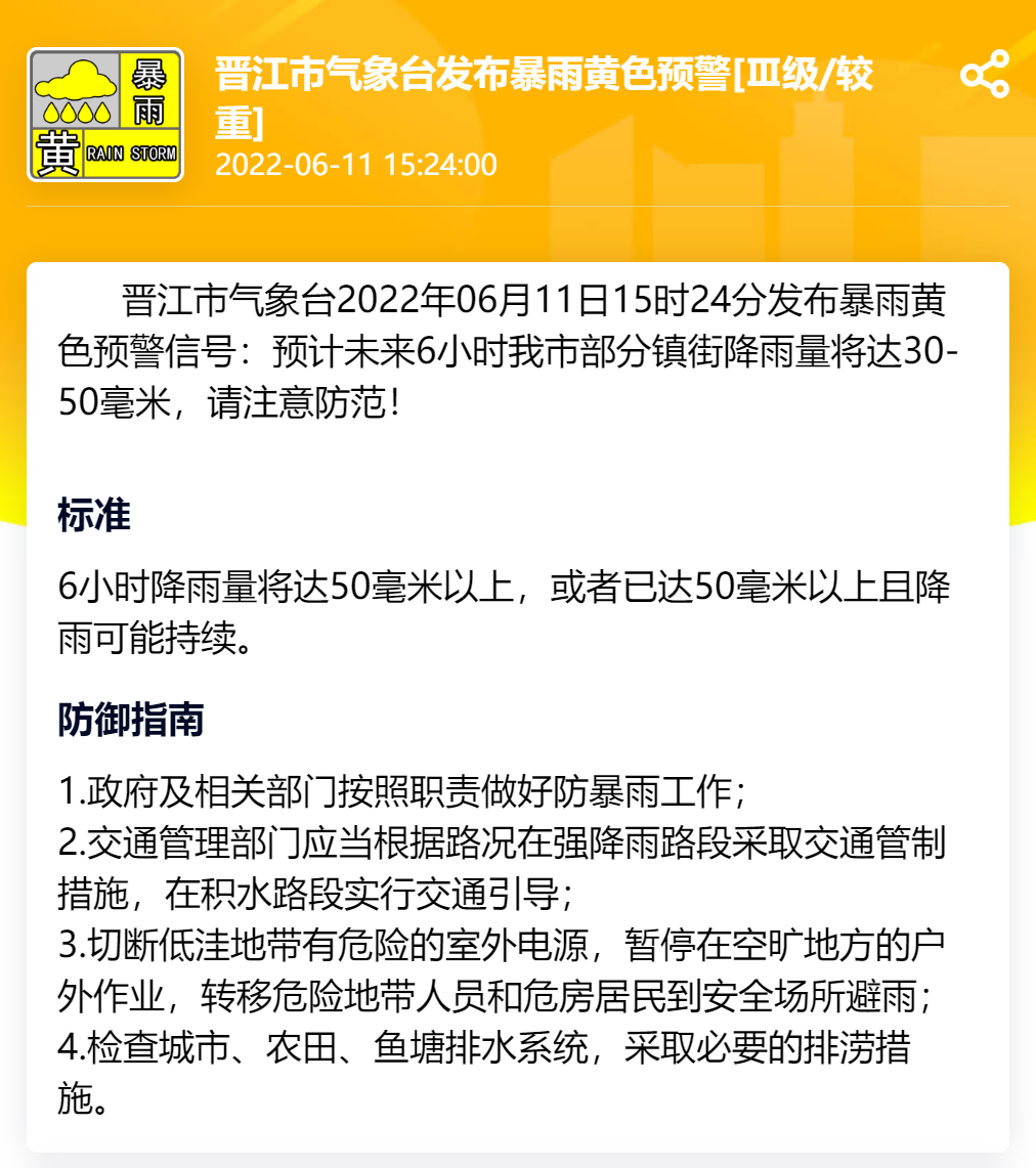 11日15时24分 晋江市气象台 发布暴雨黄色预警信号 预计未来6小时我市部分镇街 降雨量将达30-50毫米