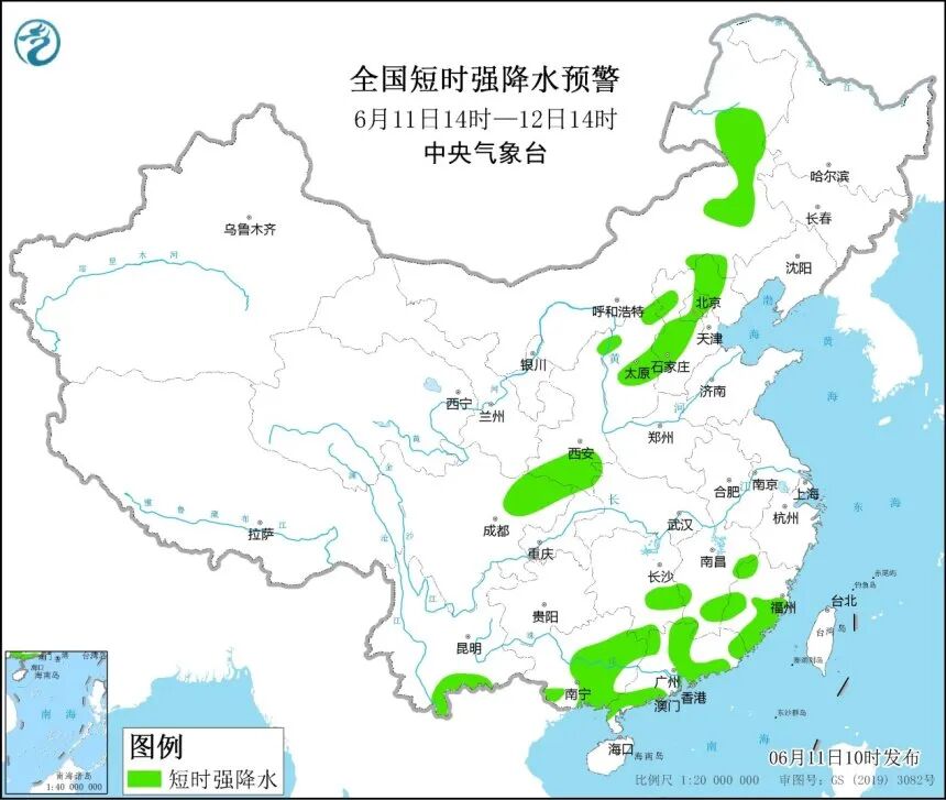 预计6月11日14时至12日14时,内蒙古东南部、陕西中北部、山西中北部、河北中北部、北京东北部和西南部、天津北部、广西东南部沿海等地的部分地区将有8-10级雷暴大风或冰雹天气;内蒙古东部、陕西南部、山西中北部、河北中北部、北京东部和南部、天津北部、湖南南部、江西南部、福建东南部和西部、四川盆地北部、云南南部、广西南部和东部、广东中西部和西南部沿海等地的部分地区将有短时强降水天气,小时雨量20-50毫米,局地可达70毫米以上。